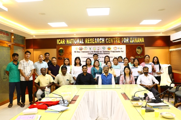 The ICAR - National Research Centre for Banana (ICAR–NRCB), Tiruchirappalli, organized a four-day (20-23 August, 2025) capacity building programme, training and transfer of technology for the government officials and farmers of Wokha District (under One District – One Product, MoFPI, GoI), Nagaland with the objective of strengthening knowledge and skills in hi-tech banana cultivation and banana-based value addition consequent upon the National Stakeholders Workshop and Panel discussion on ‘Strengthening Banana Ecosystem for Sustainable Development” held at Wokha Dt., Nagaland on 11th March 2025. The programme brought together experts from various disciplines of banana research and extension to provide practical training and technology demonstrations, enabling farmers to improve both productivity and profitability. The programme was sponsored by “ICAR – NRCB CRP on Vaccines and Diagnostics (NEH Component)”. A total of 19 including Project Manager & Skill Development Officer, ICAR-KVK SMS, Farmers, FPO and other stakeholders participated in the programme.