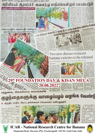 ICAR - National Research Centre for Banana (Sardar Patel Outstanding ICAR Institution -2020 Awardee) celebrated its 29th Foundation Day and Kisan Mela celebration on 20th August 2022.