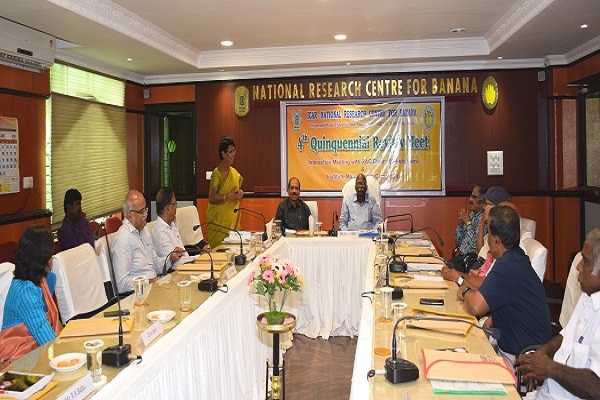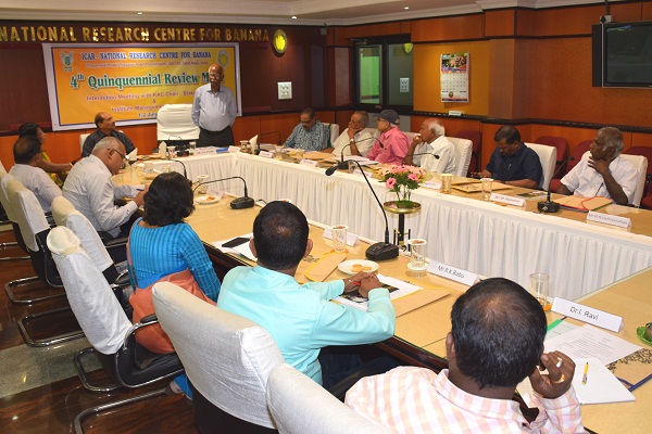 The Quinquennial Review Team (QRT) of the ICAR-NRCB held an Interaction Meeting with the XXV Institute Management Committee (IMC) of ICAR-NRCB on 02/07/2019 under the chairmanship of Dr. K. V. Peter, Chairman, QRT and the members of the QRT Dr. P. K. Ray, Dr. K. Anjaneyalu, Dr. B. P. Singh, Dr. Abraham Verghese, Dr. S. Uma, Director, ICAR-NRCB and Dr. B. Padmanaban, Member Secretary were present. The IMC members present in the meeting include Dr. N. Pugalendi, Dean, HC&RI, TNAU, Coimbatore, Dr. A. T. Sadashiva, Principal Scientist & Head, ICAR-IIHR, Bengaluru, Dr. S. K. Singh, Head, Division of Horticulture & Technology, ICAR-IARI, New Delhi, Dr. A. Selvi, Principal Scientist & Head, Div. of Biotechnology, ICAR-SBI, Coimbatore and Mr. Babu, Finance and Accounts Officer, ICAR-CIBA, Chennai and the farmers representatives Shri. M. N. Vaithiyanathan and Shri. S. P. Rajendran.