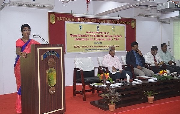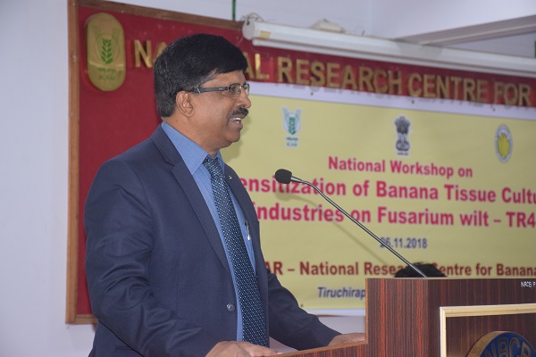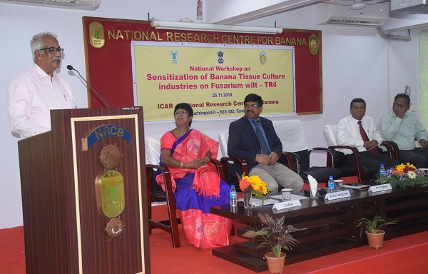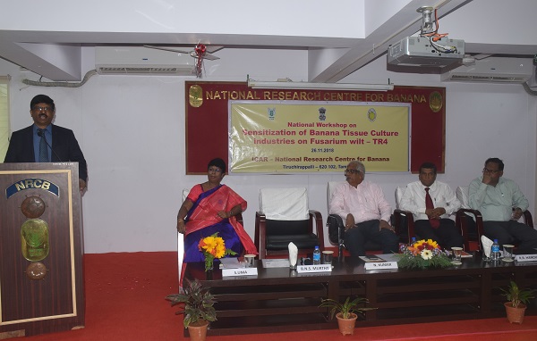 ICAR-NRCB has the responsibility to sensitize the stake holders of banana industry, like extension workers, state government officials, tissue culture industries and policy makers. Among the series NRCB hosted a high-level workshop on “Sensitization of tissue culture industries in preventing the spread of newly emerging disease - Fusarium wilt (Tropical Race 4) of banana“ on 26th November at ICAR-National Research Centre for Banana, Trichy. The meeting was attended by delegates representing major tissue culture companies from different parts of India. Dr. N. Kumar, Vice Chancellor, TNAU, was the guest of honour. Dr. B.N.S. Murthy, Horticulture Commissioner, was the Chief Guest. Dr. R.R. Hanchinal, Consultant, Bioversity International, attended the meet as a special invitee. Dr. B. Padmanaban, Principal Scientist, welcomed the gathering. Dr. S. Uma, Director, in her inaugural address gave a brief overview of the Workshop.
