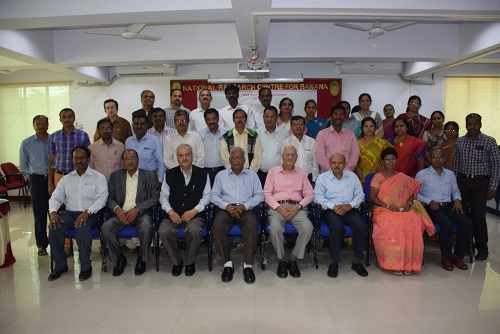 Two days Quinquennial Review Team Meeting of ICAR- AICRP Fruits was held on 19 & 20th December, 2017 at ICAR- NRC Banana, Trichy. The meeting began with the welcome address by Dr. P. Suresh Kumar who welcomed Padmashri Dr. K.L. Chadha, Chairman, QRT,other members (Dr. H.K. Senapathi, Dr. Satyabrata Maiti, Dr. V.S. Thakur and Dr. B.M.C. Reddy) and delegates of various states. Dr. Prakash Patil, Project Coordinator AICRP- Fruits, in his report outlined the impact of AICRP developed technologies on banana cultivation and spread in new areas. He made the SWOT analysis and raised concern on frequent transfer of AICRP personnel by the universities. Dr. S. Uma, Director, ICAR-NRCB & Crop coordinator emphasized the necessity to characterize the varietal wealth and need to develop new centres in north east and other needy places. She requested the officer in-charge of various centres to document the developed technologies and need to share the best clones for testing across region for recommendation as new variety. Dr. K.L. Chadha appreciated the AICRP-Fruits for development of multi-region adopted germplasm lines like NRCB-08 and NRCB-10. He was critical about the data generation and stressed the fact that more research papers must come out as combined results of various centres as this is a unique system and the potential should be tapped effectively. Thematic and centre wise presentations were made and critical comments were given by the chairman and members of the QRT for the improvement of AICRP- Fruits activities and laying the road map for the future action plan. It is advised to take up large scale multiplication of disease free quality planting material in a public- private partnership mode.The popularization of clonal selections and macro propagation through KVKs in the form of demonstration trials was also suggested.