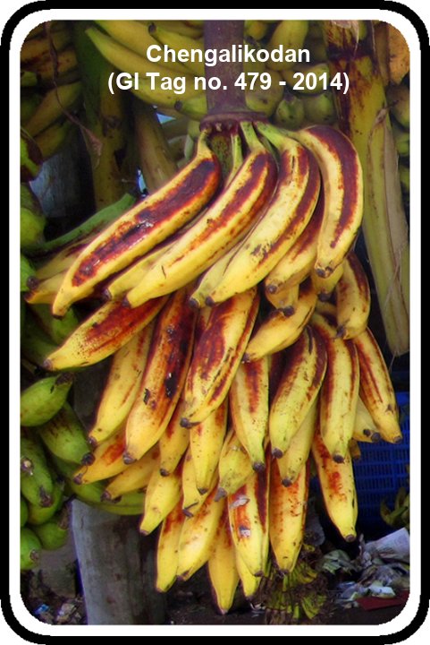 • GI Tag no. 479 - 2014 • This is the choice cultivar for making Kazhchakula, a delicacy offered to God during Onam festival. • It is cultivated in Chowannur, Desamangalam, Erumapetty, Kaiparambu, Mundoor, Ollukkara, Pazhayannur, Puzhakkal, Thayyur and Wadakkancherry of Thrissur District, Kerala. • Fruit peel is soft, bright yellow in color with rusty brown coating and pulp colour is deep orange. • It is susceptible to Cercospora leafspot and pseudostem weevil. • Bunch weight: 16-20 kgs with 20 to 25 fruits per hand. • Duration: 10 months • Sugar content: 26 to 30 Brix • Acidity: 0.31 - 0.60% • Shelf life: 7-9 days