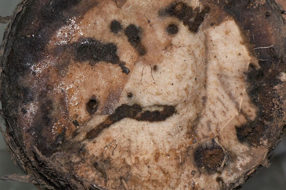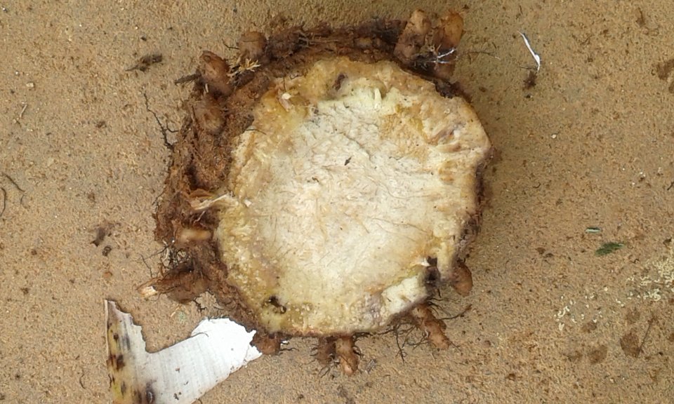 42 Banana rhizome showing tunnelling by corm weevil larva