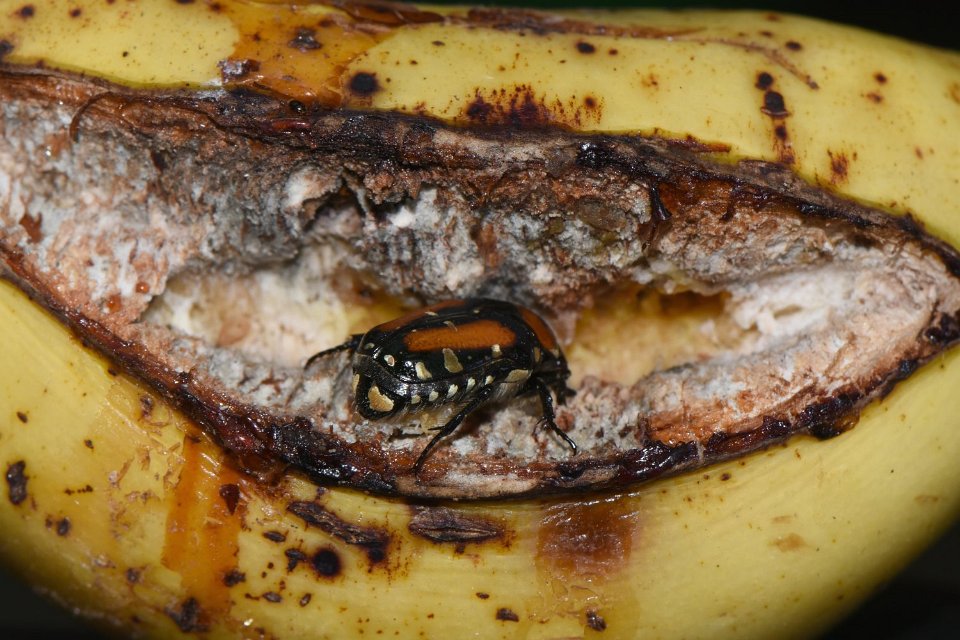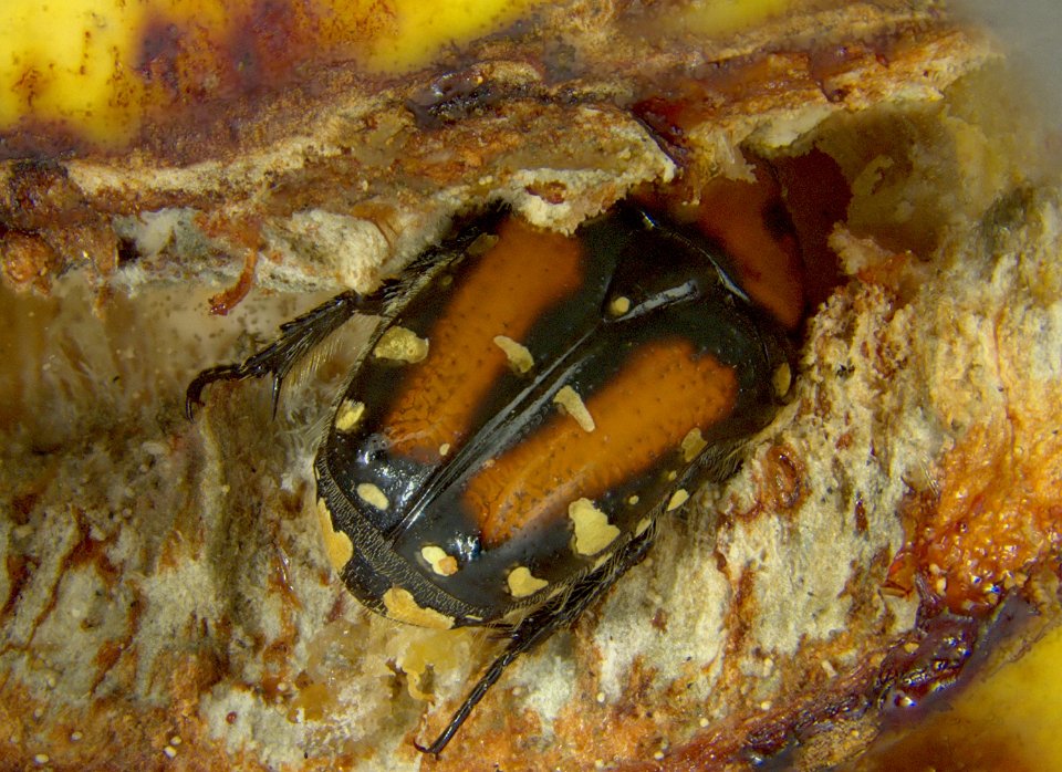 Chafer beetle, Oxycetonia versicolor, feeding on banana fruit