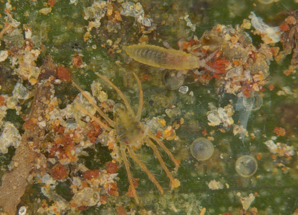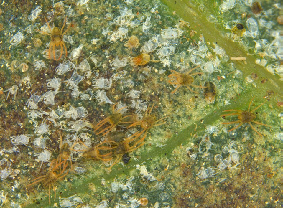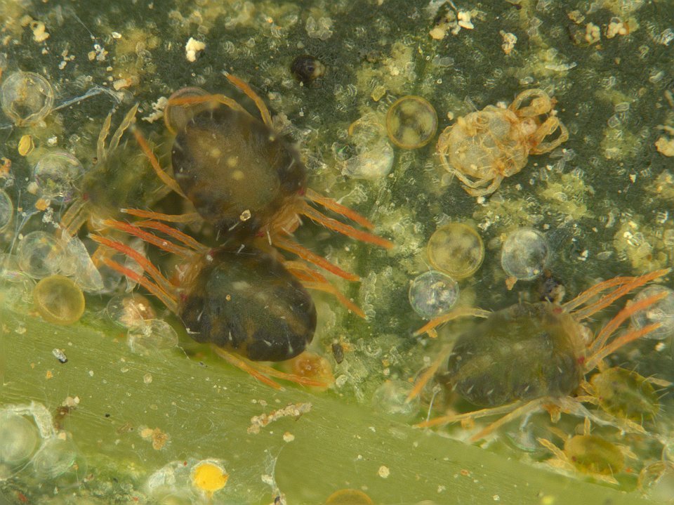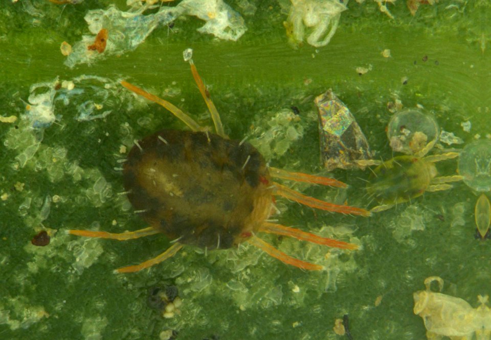 Female and male (with longer legs) of Eutetranychus orientalis on banana leaf
