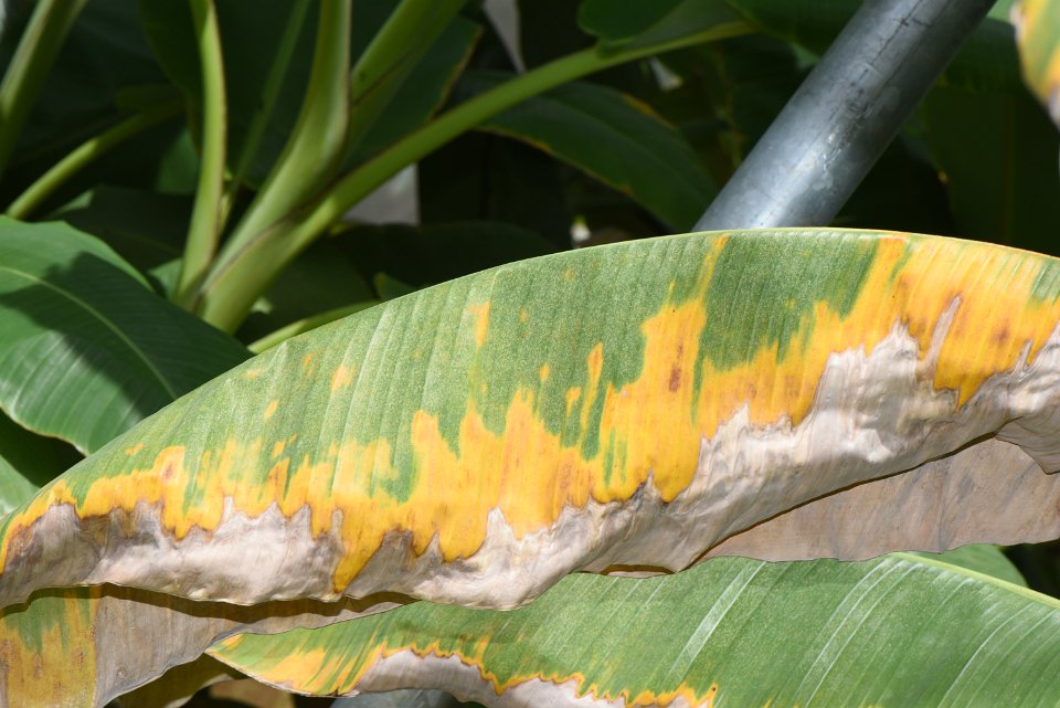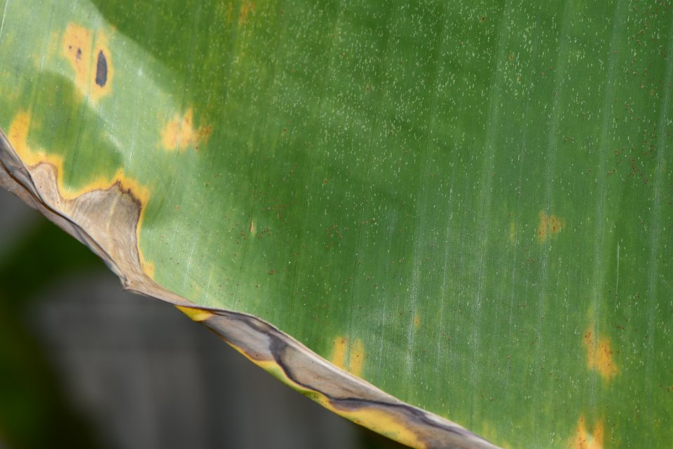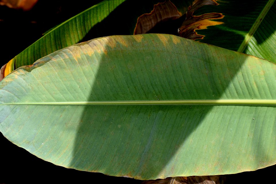 Banana leaf showing yellowing damage due to mite feeding and mite colony