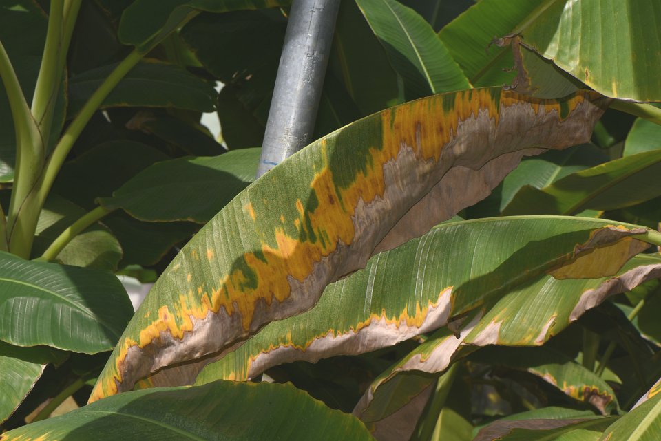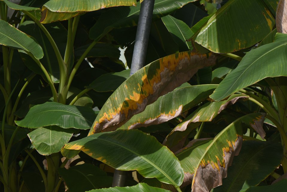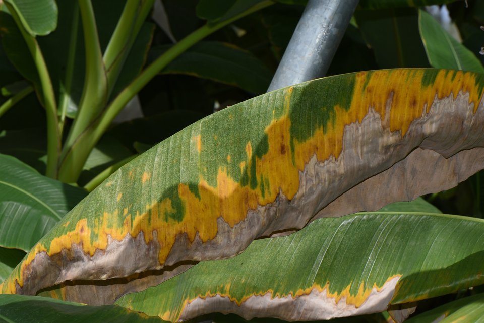 Banana leaf with severe red mite infestation (dried up from the margins)