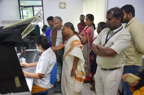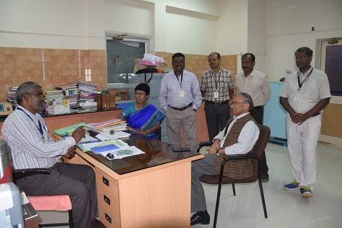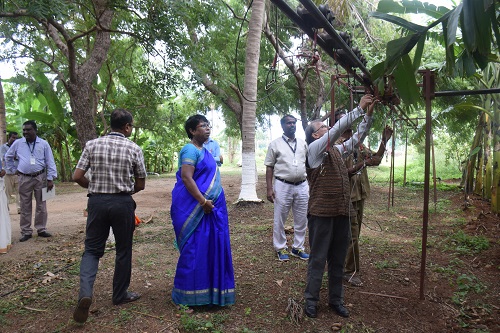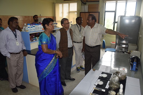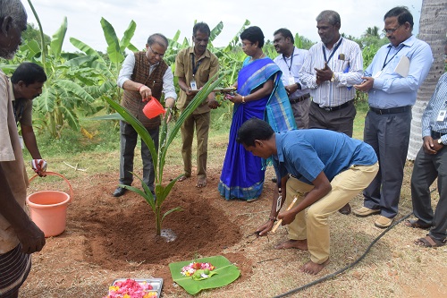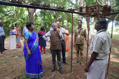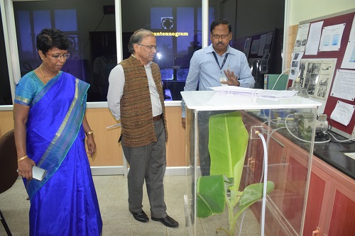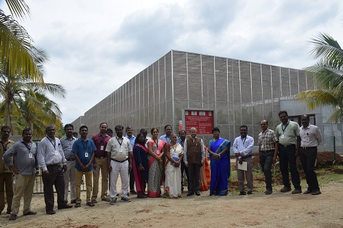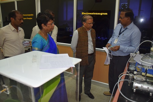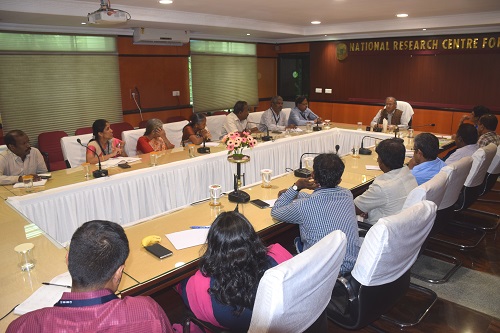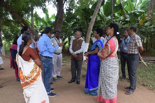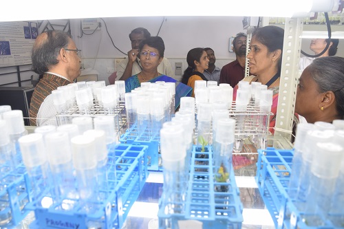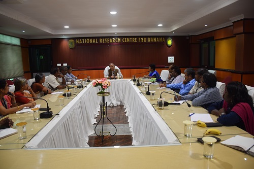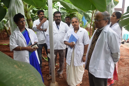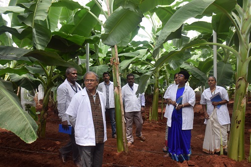 Dr. A. K. Singh, Deputy Director General (Horticultural Science), ICAR, New Delhi, visited ICAR-National Research for Banana Research Farm and Laboratories, and interacted with Scientists on 01.11.2018. He visited NRCB farm and state of art transgenic net houses facilities where transgenic plants of cv. Rasthali and Grand Naine are being grown for evaluating the fruits for provitamin A and Iron analysis and he appreciated the progress of the project and also suggested to strictly follow DBT guidelines. He insisted to develop a SOP for evaluation of transgenic bananas. He appreciated the facilities developed high through put techniques for production of quality and virus indexed banana planting materials. He also suggested that while producing planting material on large scale, more precaution should be taken for developing the virus free and true to type tissue culture plants. During visit to Crop Protection laboratories, he appreciated the efforts made on “Web app of Banana pest of India” and the bio-formulations developed for tackling Fusarium wilt especially TR4. He insisted to test the bioformulations efficacy in Foc TR4 prone areas under field conditions. He also convened a meeting with Scientists. In the meeting, he appreciated the Director and Scientists fraternity for their valuable contribution to the farmers and other stakeholders in the country. He also suggested to utilize solar energy for banana bunch conveyer and to use drone technology for diagnosis of diseases and nutrient deficiency, and to concentrate more on field deliverable technologies