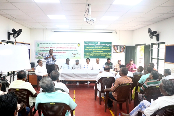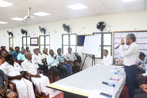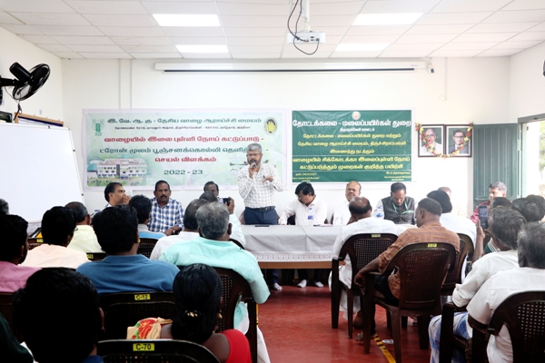 Kalakkad block in Tirunelveli district is known for banana cultivation in Tamil Nadu. Sudden outbreak of leaf spot disease created a major concern for farmers. Hence, ICAR-NRCB initiated a technological backstopping of fungicide application through drone technology in Kalakkad block. On 9th January an awareness meeting was organised for the farmers at Thirukurungudi,Kalakkad block. In the meeting; what are all the measures have to be taken by the farmers to manage the leaf spot disease in banana were discussed. After the meeting, a demonstration has been arranged at the village about fungicide application through drone technology. In the affected area, around 25 acres were covered for fungicide application through drone technology. While discussion during the farmers meeting, Dr. R. Selvarajan, Director ICAR-NRCB underlined that around 2400 ha have been affected in Kalakkad area which may cause economic loss of 5 crores approximately. This loss might have been reduced by following the proper management practices and expenditure of 15 lakhs rupees for undertaking the massive fungicide spray by drone technology