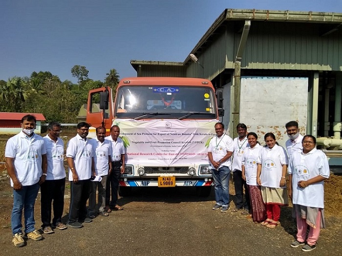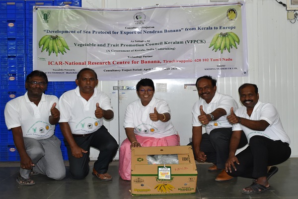 Under a joint venture by the ICAR-NRCB, Tiruchirappalli, and VFPCK, Kerala, a consignment of 10 tons of farm fresh Nendran bananas, was shipped to London on 8 th March in a first of its kind attempt to cater to the needs of Indian expatriates in the United Kingdom. An expert team from the ICAR-NRCB, comprising Dr. S. Uma, Director, Dr. R. Thangavelu, Dr. V. Kumar, Dr. K.N. Shiva and Dr. P. Suresh Kumar provided the technical expertise including developing pack house facility and shipment protocols for Nendran banana to the officials of VFPCK, Kerala. This shipment is expected to reach London well in time for sale in the markets of the UK and Scotland during Vishu, the Malayalam and Tamil New Year, to be celebrated on 14 th April. The ICAR-NRCB imparted hands-on training to banana farmers from Thrissur district on scientific cultivation of Nendran following Good Agricultural Practices to produce export quality Nendran bananas. Handpicked, hygienically harvested bunches were packed and stacked with minimum handling in the reefer containers at the APEDA certified pack house at Vazhakulam, near Muvattupuzha. A QR coded tracking system was developed by TraceX, a Bangalore based startup with technical assistance from ICAR- NRCB and VFPCK to ensure traceability.