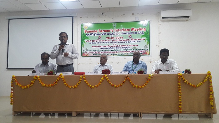 The ICAR - National Research Centre for Banana, Tiruchirapalli in collaboration with Horticultural Research Station, Kovvur, AP organized one day Banana Farmers Interface Meeting at Dr. YSR Horticultural University Campus, Venkataramanagudem on 28th April, 2016. About 120 farmers participated in the event.