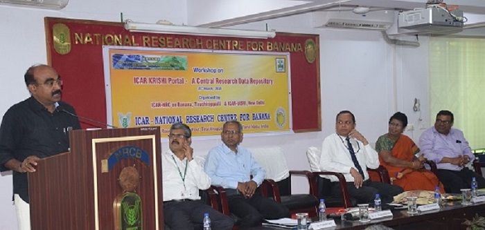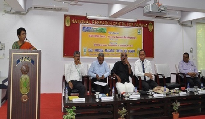A workshop on ICAR- KRISHI Portal: A Central Research Data Repository was organized at ICAR- NRC Banana (NRCB) on 25th March 2019 jointly with ICAR- Indian Agricultural Statistical Research Institute (IASRI) as first of its kind in the southern states. Dignitaries from Indian Council of Agricultural Research, New Delhi and State Agricultural Universities attended the meeting. Dr. K. Alagusunadram, Deputy Director General (Agricultural Engineering/Natural Resource Management), ICAR, New Delhi was the Chief Guest and in his address, he emphasized on the importance of data repository in ICAR and ICAR’s initiative of Knowledge based Resources Information system hub for Innovation in Agriculture (KRISHI) for making the information and knowledge resources in one place for the public access. Dr. S.K. Chaudhari, Assistant Director General (Soil and Water Management), ICAR, New Delhi elaborated the genesis of the KRISHI PORTAL project, how it has changed its vision since 2014 to become the world’s most vibrant data repository of agricultural information, where from research (meta) data to geo-portal, all the technologies, success stories and audios/videos are available at one place as an open access to wide spectrum of clienteles. Dr. S. Uma, Director of the Institute, urged the participants for change in attitude and open up the mind to share the data and technologies to farmers, fellow researchers and various other stake-holders. She insisted that transforming data into knowledge is essential in the era of Artificial Intelligence and big data analysis. Dr. Prakash Patil, Project Coordinator, All India Coordinated Research Project on Fruits (AICRP-F), with more than 70 network centers, involved in fruit research, having a common platform to bring all the data, synthesizing it are essential for drawing meaningful conclusion from the projects. Dr. Rajendra Parsad, Principal Investigator of the KRISHI Portal, IASRI, New Delhi briefed the house that in the last three years more than four lakh downloads have been taken place through this portal with maximum retrieval of data from overseas stakeholders. Under NARS (ICAR institutes and State Agricultural Universities), KRISHI Portal will be the most dynamic and vibrant portal for the agricultural research. More than 60 participants from all the southern states have participated in the workshop to learn the hands on experience on the data management through the web portal. In this occasion, NRCB received “A Special Appreciation Certificate” from ICAR, New Delhi for the effective management of data repository in KRISHI portal. Dr. R. Selvarajan, Principal Scientist and Nodal Officer, KRISHI Portal, NRCB welcomed the gathering and Dr. Mukesh Kumar, IASRI, New Delhi proposed the vote of thanks.