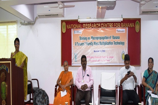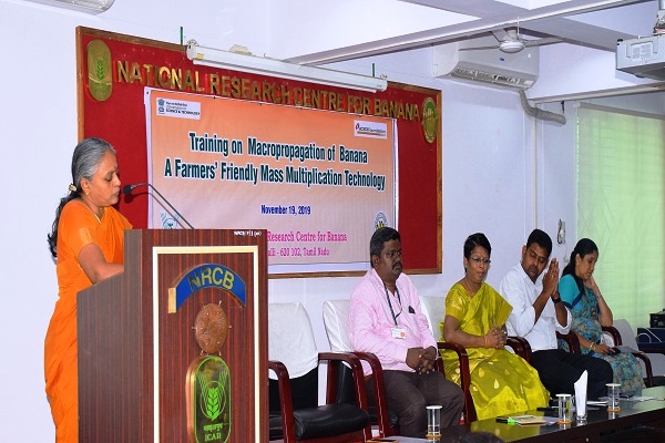 ICAR- National Research Centre for Banana, Trichy has developed a low cost farmers’ friendly technology for the mass multiplication of banana at the farm level. The quality of the planting material produced through this technology is found to be on par with tissue culture plants. ICAR-NRCB, Trichy, organized a one day training programme on ‘Macropropagation Technology’ at the centre for the benefit of the Gaja Cyclone affected banana farmers of Thanjavur and Namakkal districts which is 5th in series. This is jointly funded by ICICI foundation, Trichy Zone and SEED Division – DST, New Delhi. There was an overwhelming response from the farmers and more than 100 farmers participated and benefitted by this programme. Dr.S.Uma, Director, ICAR-NRCB in her inaugural address briefed about the significance of this low cost technology and its spread in various parts of the country. She also motivated the farmers especially women for the development of village nurseries / community nurseries with minimal investment of Rs. 10,000 per unit and such units with the recurring cost of Rs.4000 will be able to produce almost 2000 plants. So each plant costs about Rs.2 and even if sold at Rs.5 per plant, this will be an economically viable enterprise. NRCB also planned to take up off-site training programme at villages to train SHG’s, FPOs’ and farmers to multiply their own banana planting material in a short period.