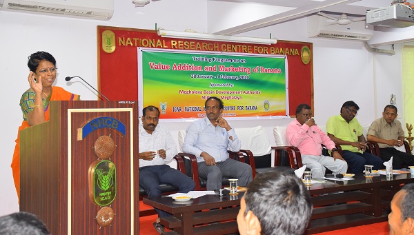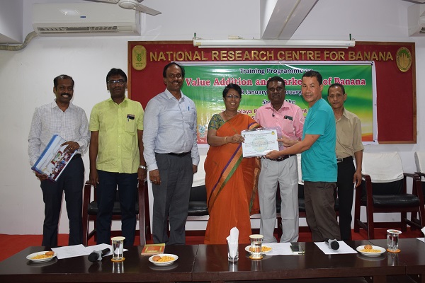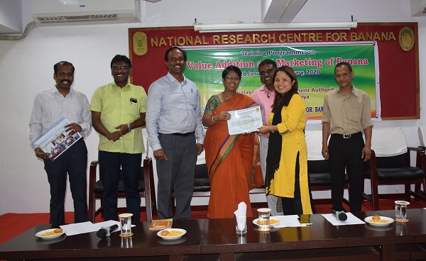 ICAR- National Research Centre for Banana, Trichy has organized five days Entrepreneurship Training Programme on ‘Value addition and Marketing of banana’ to farmers and entrepreneurs of North Eastern state, Meghalaya. The training was sponsored by Meghalaya Basin Development Authority [MBDA], Shillong, Meghalaya. A total of 15 participants took part in the hands-on training programme. The programme was focussed on cultivation, production and marketing of value added products from green unripe and ripe bananas as well as from other parts of banana and plantain aiming at present government strategies like Skill development for the least developed states, wealth generation from waste and doubling the farmers’ income. They have been educated on importance of getting license from Food Safety and Standards Authority of India as food safety measures. During the Presidential address, Dr. S. Uma, Director of the institute appreciated the trainees for taking keen interest in selecting banana value addition as their business option for their development, as banana being an important commercial crop for the livelihood of NE state. She also emphasised the importance of rural youth, both men and women’s active participation in the upliftment of the society. While speaking on the occasion, Mr. Fairborn Gathphoh, Business Development Officer, MBDA thanked the Centre for hosting the fruitful training programme in short-time for the benefit of farming community, entrepreneurs and officials of Meghalaya state. Drs. V. Kumar, K.N. Shiva, and Dr. P. Suresh Kumar, Course coordinators briefed that the entrepreneurs learnt new skill on cultivation, value addition and marketing of more than 30 different value added products such as Banana Fig, Jam, RTS fruit juice, Sweet chutney from ripened fruits; Chips, Sauce, Flour, Baby Food, Health drink, Soup mix and bakery products from unripe fruits; Pickle (thokku) from flowers and Candy from central core stem and Fibre from pseudostem sheath. As a part of the training programme, they have been taken to Solar Dryer unit and banana market to understand marketing system and role of FPO’s in the state.