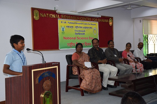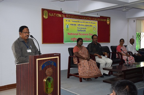 The ICAR-National Research Centre for Banana Trichy celebrated “National Science Day” with an objective to expose the recent developments in agricultural research particularly in banana and to create an awareness and motivation among the students of various schools in Trichy and Karur Districts on 29th February, 2016. On this day, the research centre was open to the students to show-case the research activities of the Institute and also interaction with the scientists and researchers to motivate the students on the opportunities available in horticulture and agriculture as career. The research centre made elaborate arrangements to display the advanced technologies developed on various aspects of banana production.