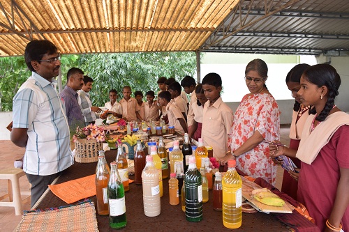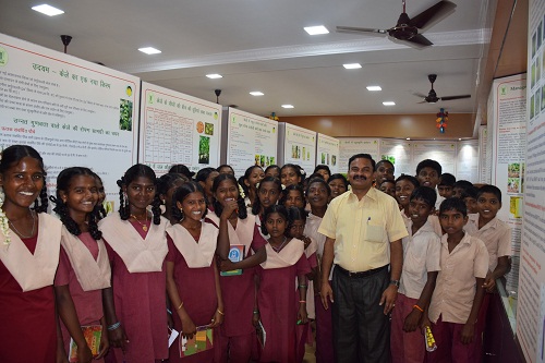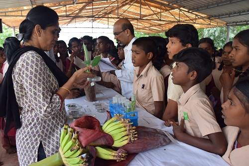 In this function, around 350 students from different schools in Trichy and Karur districts participated. The NRCB Scientists/ Technical Officers explained the various research activities of the centre like banana varieties, tissue culture techniques, soil management, bunch sleeving, eco-friendly and biocontrol methods for managing insect pests, nematodes, fungal and viral diseases. Samples of value added banana products prepared at NRCB were given to all students and very good response was noticed among the visitors.
