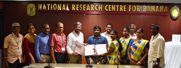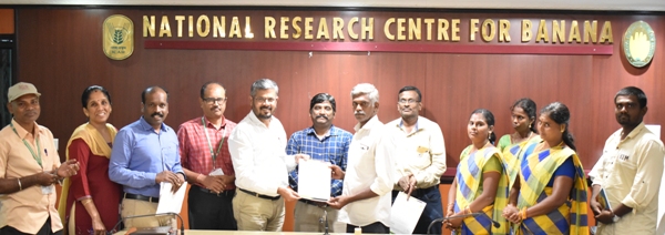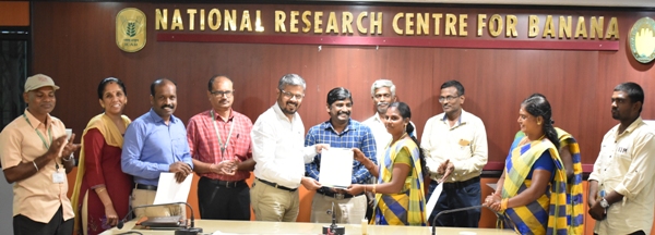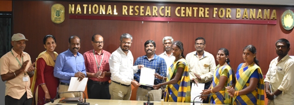Srirangam Banana Producers organization is the initiative of women banana farmers with the 1200 members at Tiruchirappalli. Because of its reputes the FPO received financial assistance from the District Project Management unit of Trichy under the Business Innovation Fund of the ‘Vazhlndhu Kattuvom” (Lets’ live) scheme. As part of the aegis of ‘Vazhlndhu Kattuvom” scheme at Tiruchirappalli, the FPO had an agreement of ToT with the ICAR-NRCB for business venture of production of ‘Banana Shakti’ mainly for the economic empowerment of women farmers for their livelihood. The Trichy unit of M. S. Swaminathan Research Foundation - MSSRF organization has also supported the initiatives of the women FPO. On 13th December, 2022, the agreement between the FPO and ICAR-NRCB has been signed for technology transfer of Banana Shakti. Three female farmers and two male farmers received a know-how training from ICAR-NRCB for the production process of the micro-nutrient mixture. Dr. R. Selvarajan, Director, ICAR-NRCB said micronutrient deficiency is a common problem in banana cultivation and has a huge impact on the yield and quality. Therefore, ICAR-NRCB has focused its research programme on micronutrient requirements. The micro nutrient mixture is gaining popularity among the banana farming community. And the current initiative to support the FPO women farmers with the technological backstopping will certainly pave the way not only in the upscale of the technology but also will create a good impact in economic level of the women farmers. Dr. K. J. Jeyabaskaran, Principal Scientist and inventor of the technology briefed that "Banana Shakti" corrects the micronutrient deficiency and increases the ‘use efficiency’ of primary and secondary macronutrients in banana crop, thereby increases the productivity by 15 - 20% and enhances the quality. By using Banana Shakti, an additional net profit up to Rs. one lakh per hectare could be accrued. Mr. I. Aroon Joshva Rusewelt, DEO, VKP, Trichy and Karur and S. Murugesan, DEO, MSSRF appreciated the team for taking the production technology for livelihood improvement. During the event the Dr. P. Suresh Kumar, Principal Scientist and nodal officer, ITMU, Technical officer Mr. R. Pichai Muthu, technical staffs of ICAR - NRCB, Chairman, members and beneficiaries of women farmer of the Producer Company were also present.