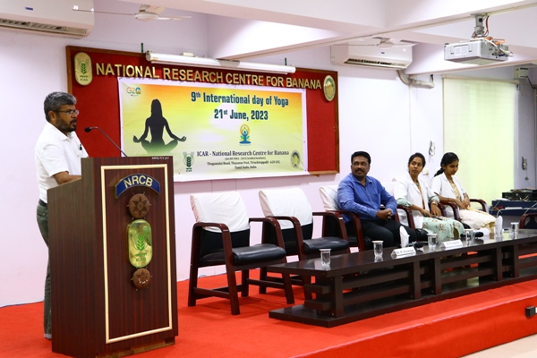 The 9th International Day of Yoga was observed at ICAR National Research Centre for Banana, Trichy. On this occasion, Dr. R. Selvarajan, Director, ICAR NRCB, briefed about the theme of this 9th International Yoga Day and said that it emphasizes the health of every individual through yoga practice and regular practice boosts up the immune system and thereby helps in maintenance of good health. Special guest Dr. R.Sugumar, Shri Jayarangha Nature Cure Hospital, Trichy, created awareness about Yoga which establishes harmony between body and mind, leading to a healthy and disease-free life