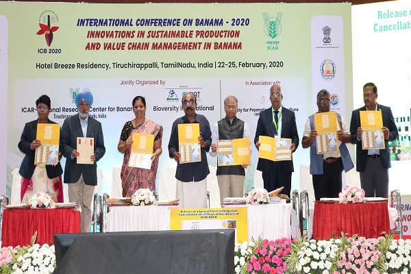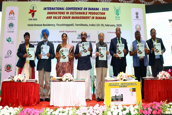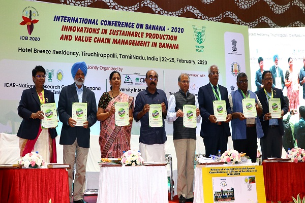 International Conference on Banana 2020 - "Innovations in Sustainable Production and Value Chain Management in Banana" jointly organized by the ICAR - National Research Centre for Banana, Tiruchirappalli; Society for Promotion of Horticulture, Bangalore; and Alliance Bioversity International - CIAT, was formally inaugurated on 22.2.20 at Kalaiarangam Auditorium, Trichy. Dr. S. Uma, Director, NRCB, welcomed the delegates to the conference organized commemorating the Silver jubilee celebrations of ICAR-NRCB. She also briefed on the conference dedicated to banana, a common man's fruit as banana farmers face many challenges that affect productivity.
