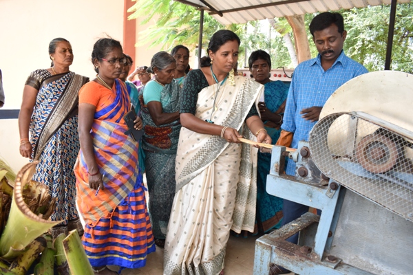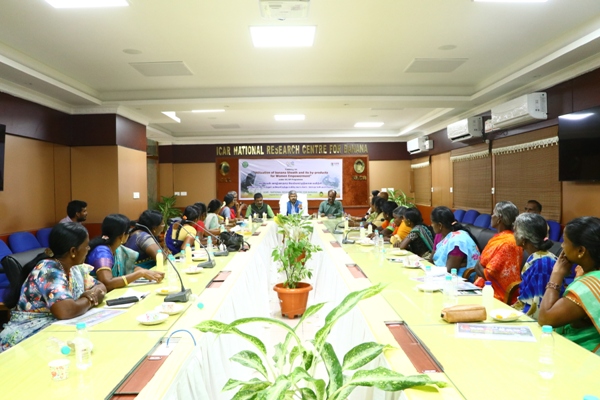 ICAR-NRCB organized a transformative five-day hands-on training initiative from January 8-12, 2024, centered on 'Utilization of banana sheath and its by-products for women empowerment' under the SCSP programme in Tamil Nadu. The primary goal was to empower underprivileged women economically by equipping them with skills to harness the potential of banana sheath for crafting diverse products such as baskets, mats, curtains, and cushions. This program also sought to broaden their horizons by exploring effective marketing strategies.