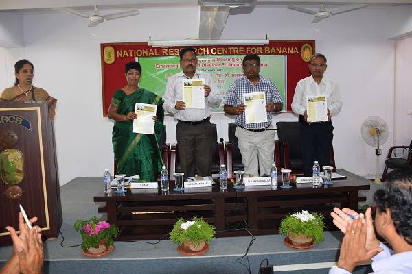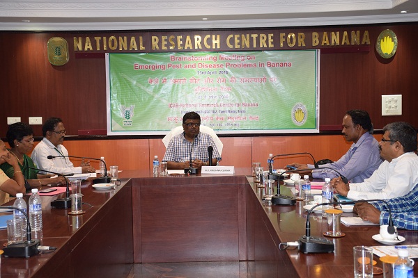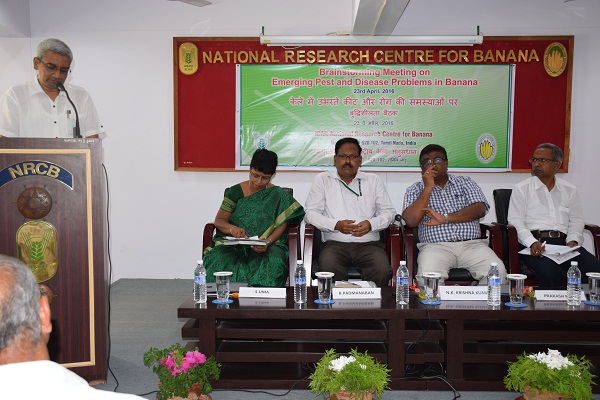 The ICAR National Research Centre for Banana, Tiruchirapalli organized one day Brainstorming Discussion Meeting on "Emerging Pests and Disease Problems in Banana" on 23rd April, 2016. The main focus of the meeting was to evolve the strategies for controlling the spread of dreaded TR-4 Panama Lethal Diseases of banana which is a threat to the banana industry globally. The Inaugural Session was graced by Dr. N.K.Krishna Kumar, Dy. Director General (Hort. Science), ICAR, New Delhi . Dr. B. Padmanaban, Director (Acting), ICAR-NRCB presented the overview of Emerging pests and diseases in banana. Dr. Prakash Patil, Project Coordinator, AICRP on Fruits, IIHR, Bengaluru ; Dr. Sadasakthi, Representative of Commissioner of Horticulture and Plantation Crops, Govt. of Tamil Nadu, Shri R. Krishnamurthy, Dy.Director of Horticulture, representing the Agril. Production Commission and Secretary, Dept. of Agriculture, Govt. of Tamil Nadu ; Scientists working on banana from ICAR Institutes, SAUs, Plant Quarantine Departments and Representatives of Farmers Association were also participated. This was followed by Technical Sessions wherein the issue was discussed in detail to develop a strategic and action plan to contain the spread of dreaded disease in India.