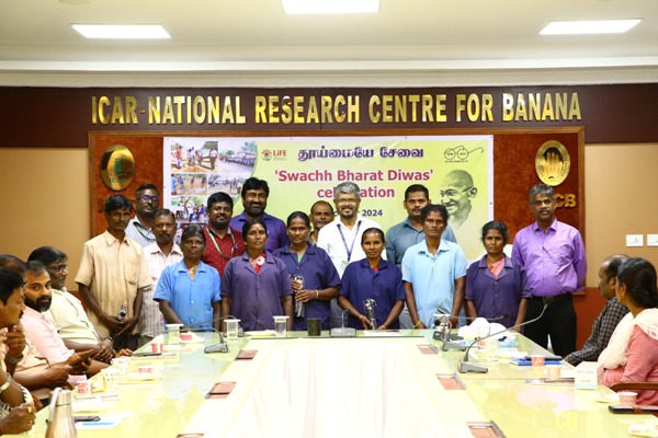 The Swachhta Hi Seva campaign (theme'Swabhav Swachhata - Sanskaar Swachhata') was organized at the ICAR-National Research Centre for Banana, Trichy, from September 17 to October 2, 2024. The program was inaugurated by the director, Dr. R. Selvarajan, ICAR-NRCB. The display of banners of the Swachhta Hi Seva campaign was placed at the ICAR-NRCB office building, the Institute Research Farm, and the residential complex. All staff members at the ICAR-NRCB office took the Swachhta Pledge during the event. A selfie point was also installed at ICAR-NRCB and Keerikalmedu village to spread the Swachhta Hi Seva messages through mass media.On September 17, 2024, a plantation drive 'Ek Ped Maa ke Naam' was held at the ICAR-NRCB research farm, and roughly 100 saplings were planted. The chief guests, Dr.Selvarajan R., Director of ICAR-NRCB, and Mr. Karmegam, former DGM of TNPL, participated alongside scientists and farm workers in this mass plantation drive.